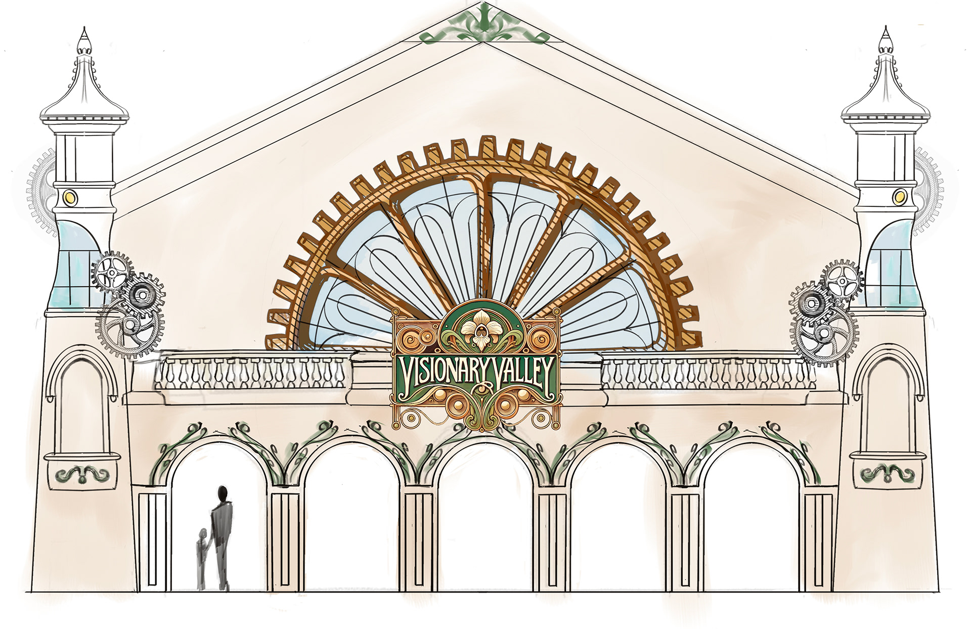 Elevation design for an immersive experience that has guests explore all the types of art. The facade was inspired by old Coney Island amusement parks with art nouveau and steampunk elements.